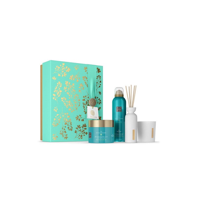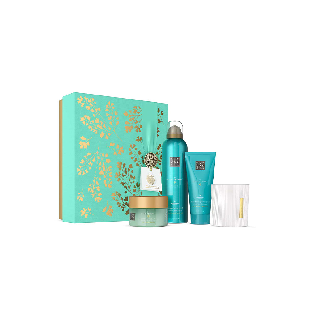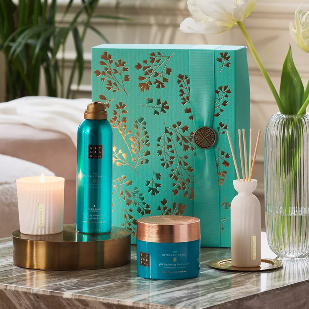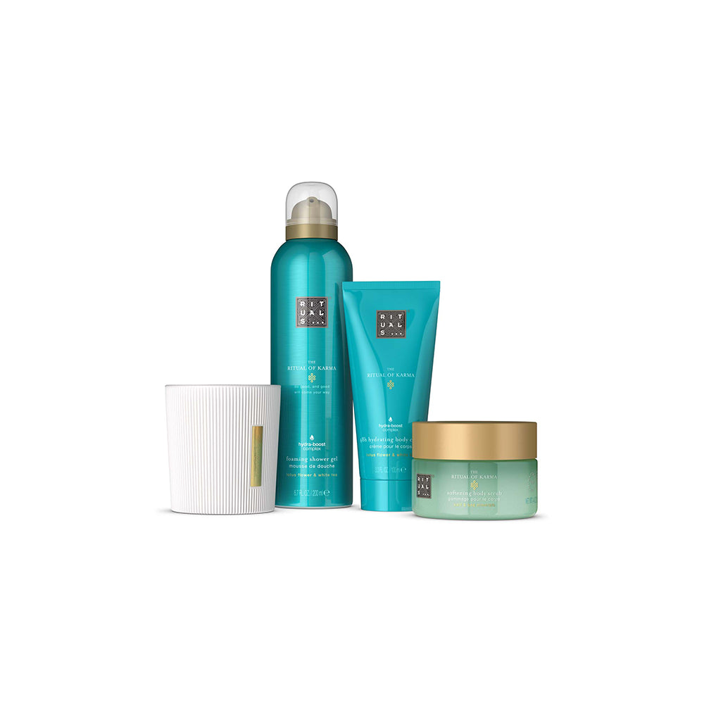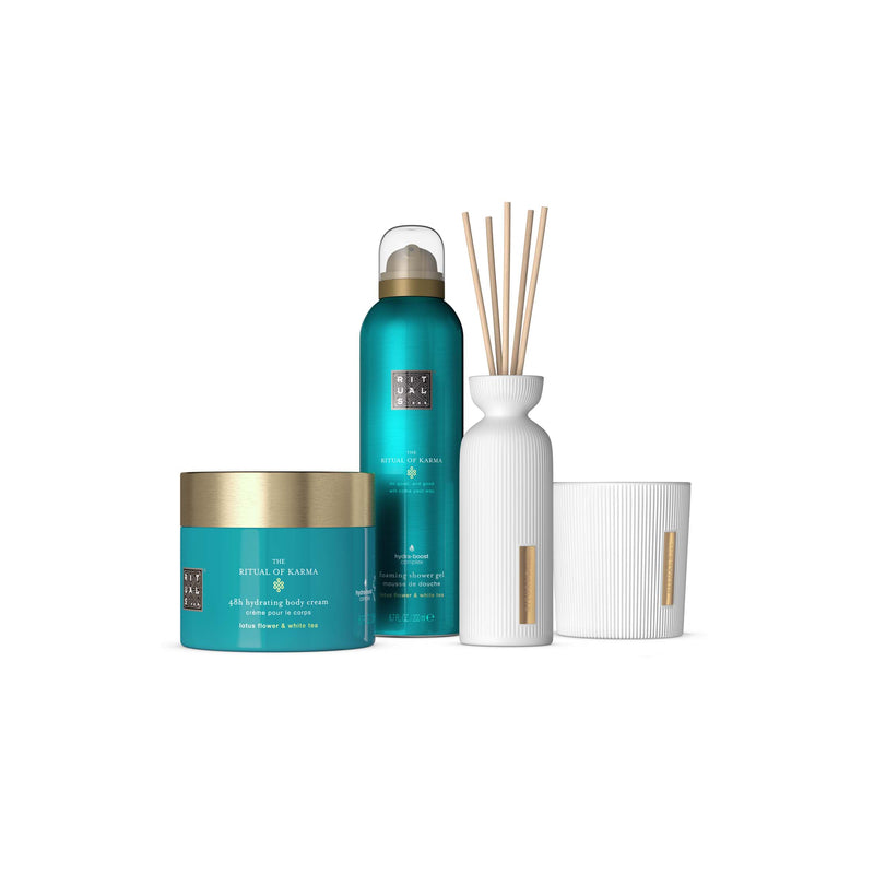 The Ritual of Karma to inspirująca kolekcja Rituals, stworzona zgodnie z starożytną hinduską filozofią, aby pomóc Ci promieniować pozytywną energią i praktykować życzliwość w codziennym życiu. Ta wyjątkowa linia produktów została wzbogacona o kojący zapach białej herbaty i świętego lotosu, który wprowadza letnie, świeże wibracje do Twojej rutyny pielęgnacyjnej przez cały rok. Wszystkie produkty zawierają rewolucyjny Hydra-Boost Complex z aloesem, skwalanem i algami, który zapewnia intensywne nawilżenie skóry na 48 godzin, pozostawiając ją jedwabistą i promieniującą. Dostępne są zarówno produkty do pielęgnacji ciała jak żele pod prysznic, kremy, peelingi i olejki z efektem shimmer, jak również zapachy do domu w formie świec, patyczków zapachowych i perfum do wnętrz. Wybierz The Ritual of Karma i pozwól, aby filozofia dobrej karmy i aromaty białej herbaty z lotosem towarzyszyły Ci w tworzeniu pozytywnych rytuałów, które będą odżywiać zarówno Twoją skórę, jak i duszę.